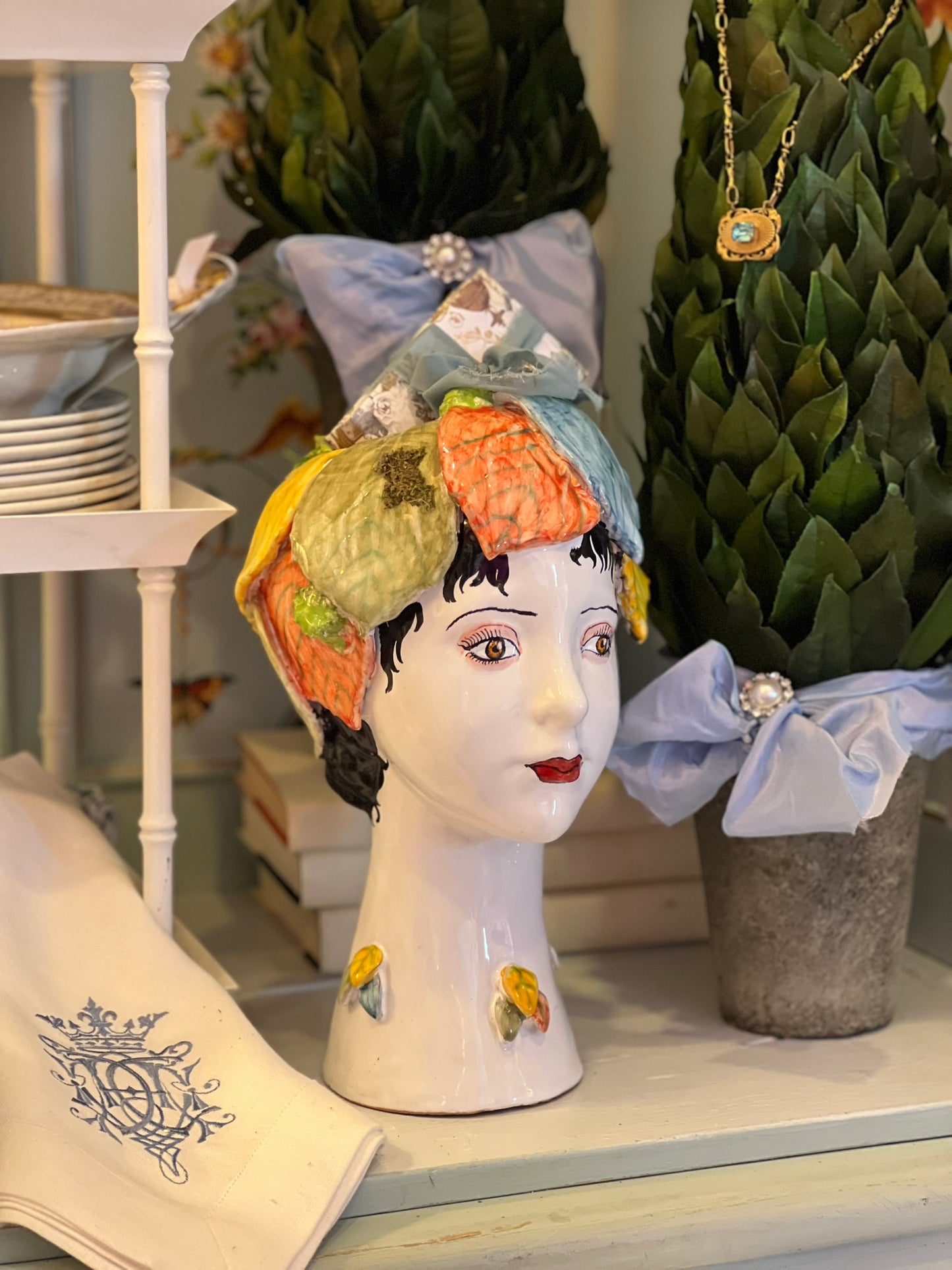 The Donatello Collection is a collection of medium-sized hand-painted vases that draws inspiration from the Tuscan tradition, as well as the cultural and natural elements of the region. The collection is named after the women's heads depicted on the vases, and features a range of Tuscan plants and fruits.