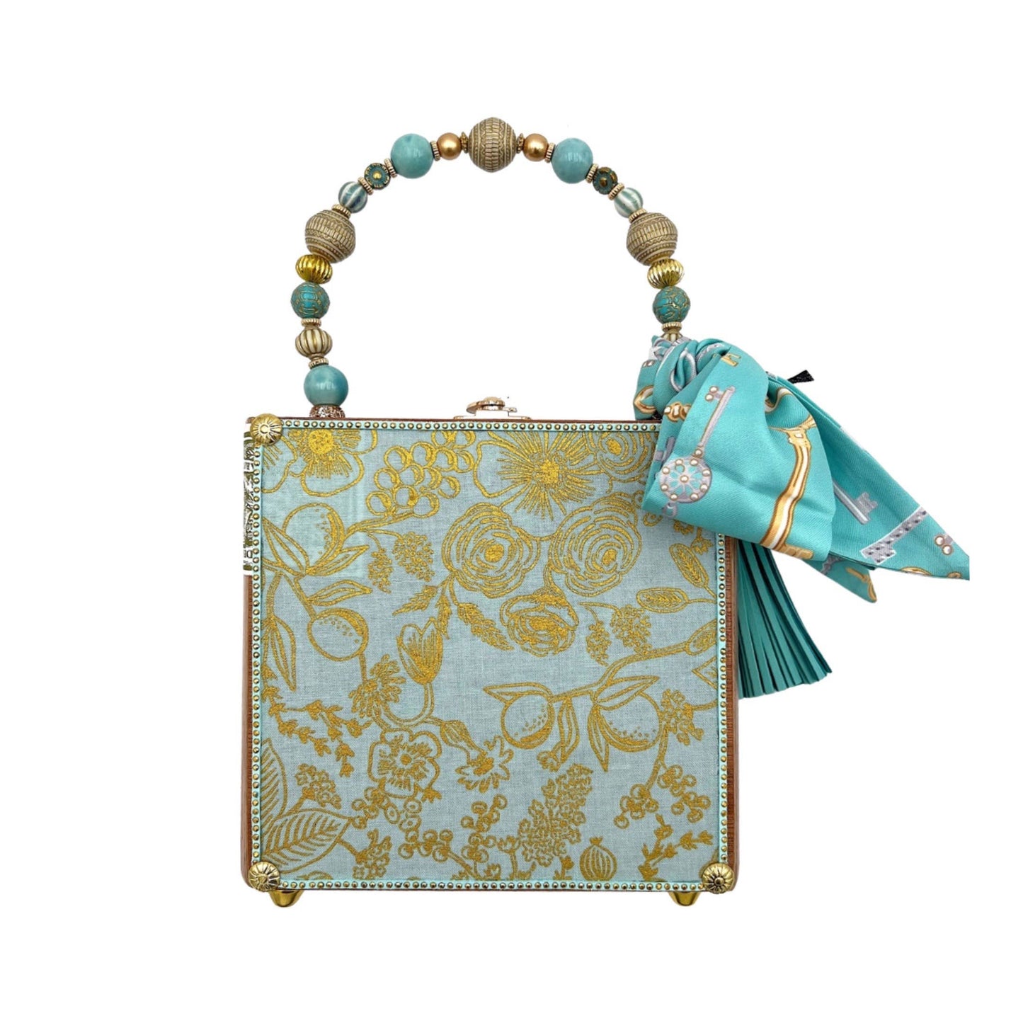 Other details include: silky, tassel, beaded handle, and brass hardware (clasp, hinges, tacks, and purse feet) have been added. Interior is finished with a velvety liner and small mirror. The box is upcycled from a former cigar box, (which has been thoroughly de-odorized), and all original hardware and labels are left intact when possible. Each box has been scrutinized prior to selection, and although small scratches or signs of mild wear and tear are normal, they are considered part of the charming character of these bags, making each one truly one of a kind.